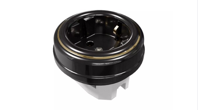 Материал: Фарфор Цвет: золото на черном Размер: D70х45мм Характеристики: 16А, 250В, IP 20 Декоративная двухполюсная ретро розетка фарфоровая с заземляющим контактом.